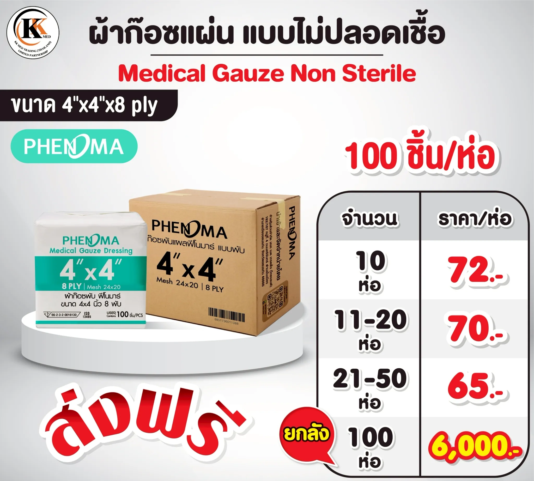 ผ้าก๊อซพับ PHENOMA ขนาด 4×4 นิ้ว 8 พับ Non-Sterile Medical Gauze Dressing ผ้าก๊อต ผ้าก๊อตปิดแผล