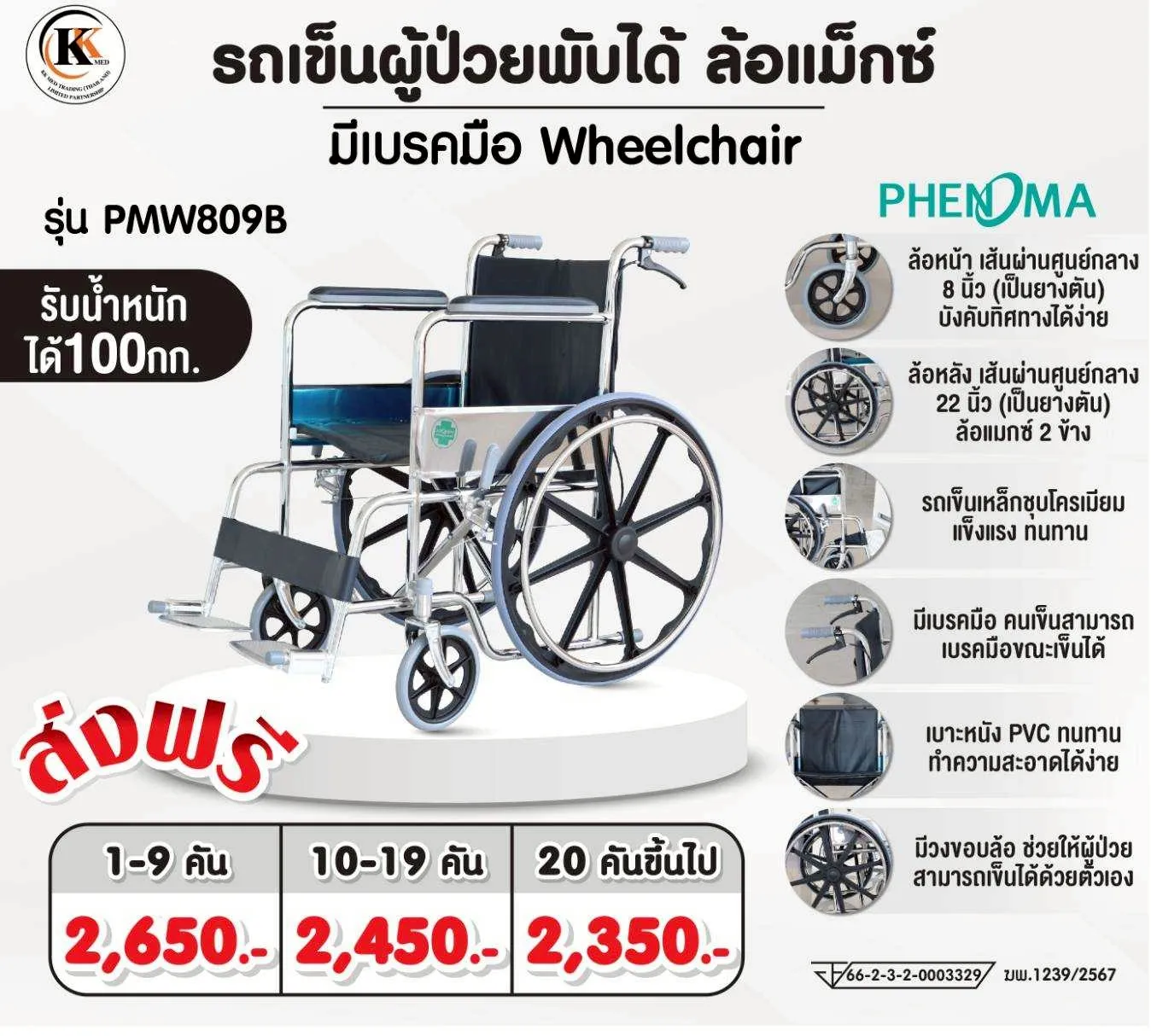 รถเข็นผู้ป่วย PMW809B ล้อแม็ก ยางตัน มีเบรคมือ PHENOMA Wheelchair มาตรฐานโรงพยาบาล