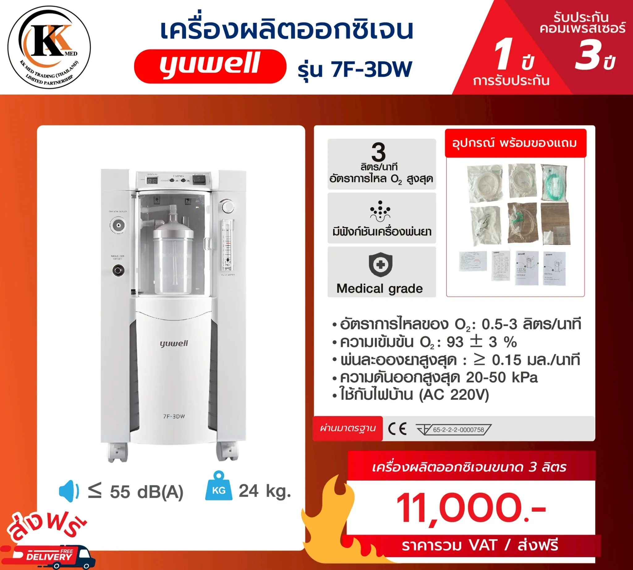 ⭐ NEW !! ⭐ เครื่องผลิตออกซิเจน ยี่ห้อ Yuwell 3 ลิตร Yuwell รุ่น 7F-3DW เสียงเครื่องเงียบ รับประกัน Compressor 3 ปี ตัวเครื่อง 1 ปี+ เซ็ตสุดคุ้ม