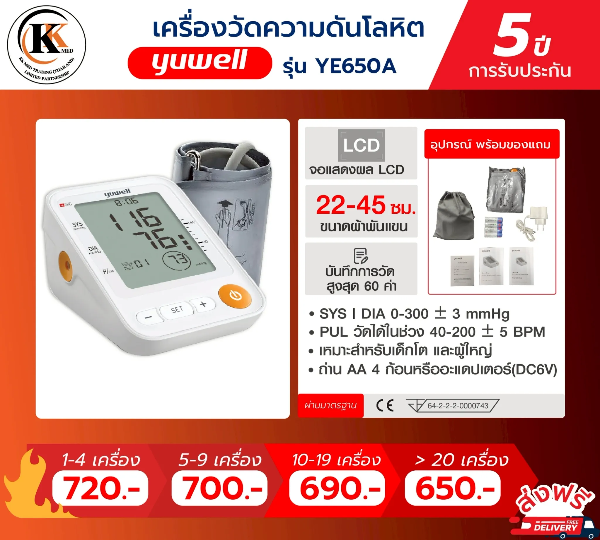 เครื่องวัดความดัน Yuwell Thailand รุ่น YE650A ประกันศูนย์ 5 ปี Blood Pressure Monitor เครื่องวัดความดันโลหิต ใช้งานง่าย